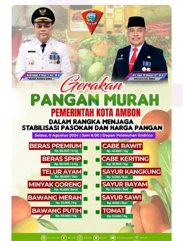 Gerakan Pangan Murah (GPM), kembali akan digelar Pemerintah Kota (Pemkot) Ambon, Selasa (6/8/24) besok, di Pelabuhan Enrico, jalan Pantai Mardika Mulai pukul 07.30 WIT.