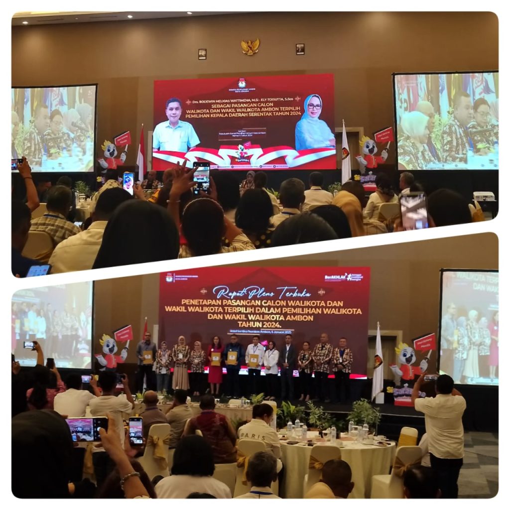 Komisi Pemilihan Umum (KPU) Kota Ambon resmi menetapkan pasangan Bodewin Melkias Wattimena dan Ely Toisutta (BETA) sebagai Wali Kota dan Wakil Wali Kota Ambon terpilih periode 2025-2030. Penetapan ini dilakukan dalam Rapat Pleno Terbuka di Hotel Santika Premier, Kamis (6/2/2025) malam.