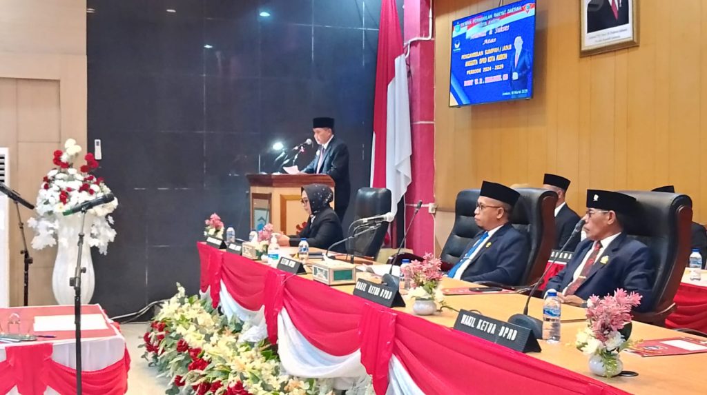 Wali Kota Ambon, Drs. Bodewin M. Wattimena, M.Si, menghadiri Rapat Paripurna DPRD Kota Ambon dalam rangka pelantikan dan pengambilan sumpah Body Wane R. Mailuhu, SE, sebagai anggota DPRD Kota Ambon periode 2024-2029.