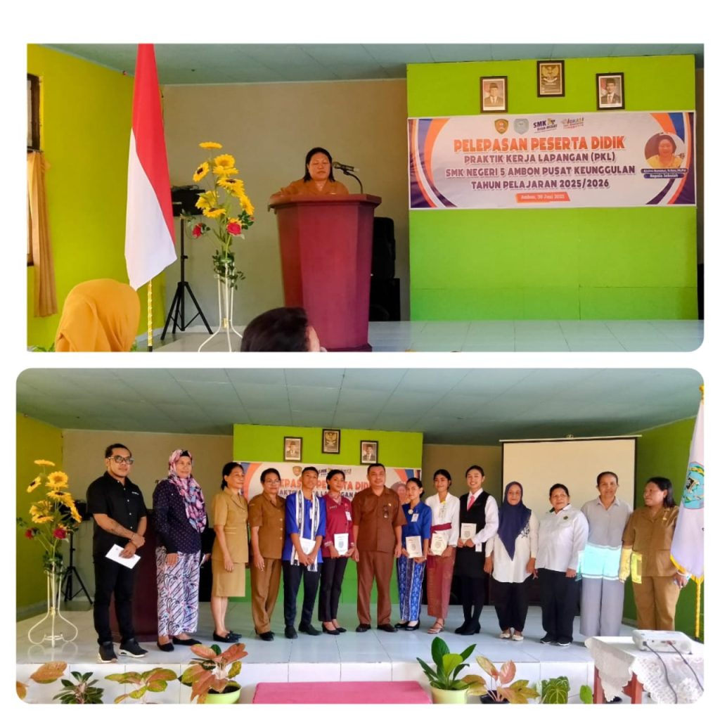 SMKN 5 Ambon sebagai salah satu sekolah pusat keunggulan kembali melepas sebanyak 83 siswa-siswi terbaiknya untuk mengikuti kegiatan Praktek Kerja Lapangan (PKL) Tahun Pelajaran 2025/2026. Acara pelepasan berlangsung khidmat di Aula SMKN 5 Ambon pada Senin (30/6/2025), ditandai dengan penyerahan simbolis siswa kepada perwakilan dunia industri.