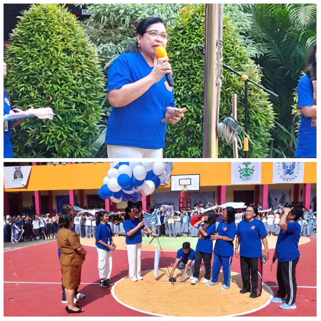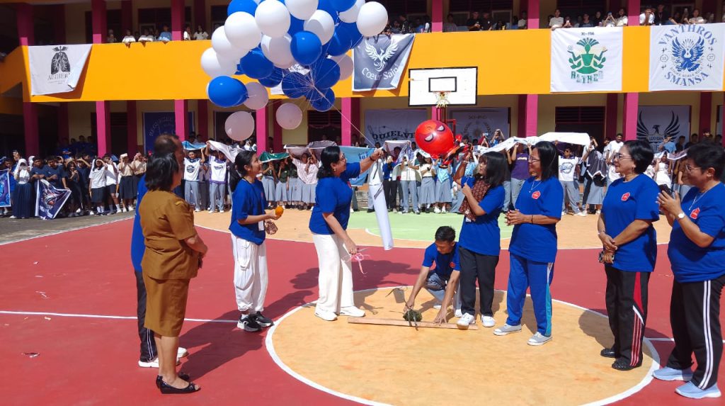 Kepala sekolah Dra. E. Laturiuw, M.Si, secara resmi membuka kegiatan dengan menggunting pita dan melepas balon gas ke udara, didampingi pengawas sekolah dan para wakil kepala sekolah.