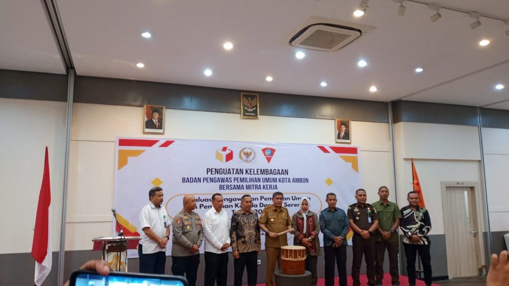 Wali Kota Ambon Bodewin Wattimena menghadiri kegiatan penguatan kelembagaan Badan Pengawas Pemilihan Umum (Bawaslu) Kota Ambon bersama mitra kerja. Kegiatan ini bertujuan untuk melakukan evaluasi pengawasan pemilihan umum dan pemilihan kepala daerah serentak tahun 2024.kegiatan ini bertempat di manise hotel Senin(15/09/2025)