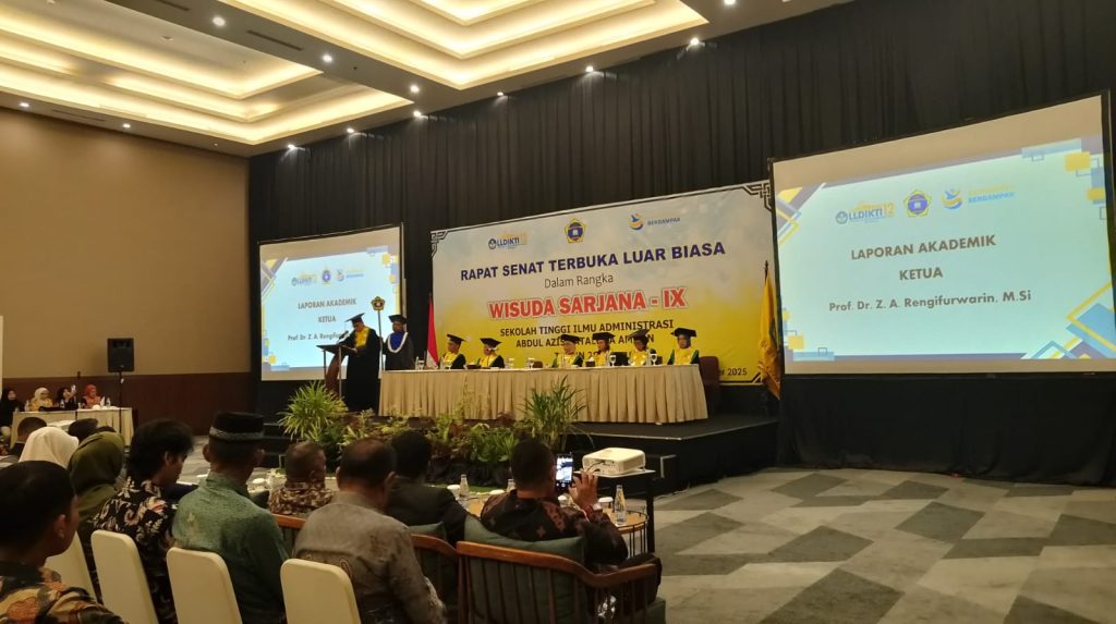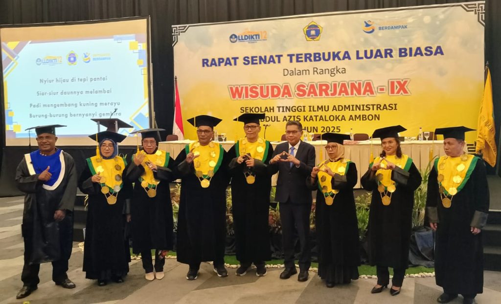 Sekolah Tinggi Ilmu Administrasi (STIA) Abdul Aziz Kataloka Ambon kembali melahirkan sumber daya manusia baru melalui pelaksanaan Wisuda Sarjana ke-IX Tahun 2025. Sebanyak 52 mahasiswa resmi menyandang gelar sarjana dalam rapat senat terbuka luar biasa yang digelar di Lantai 5 Hotel Santika Premiere Ambon, Sabtu (20/12/2025).