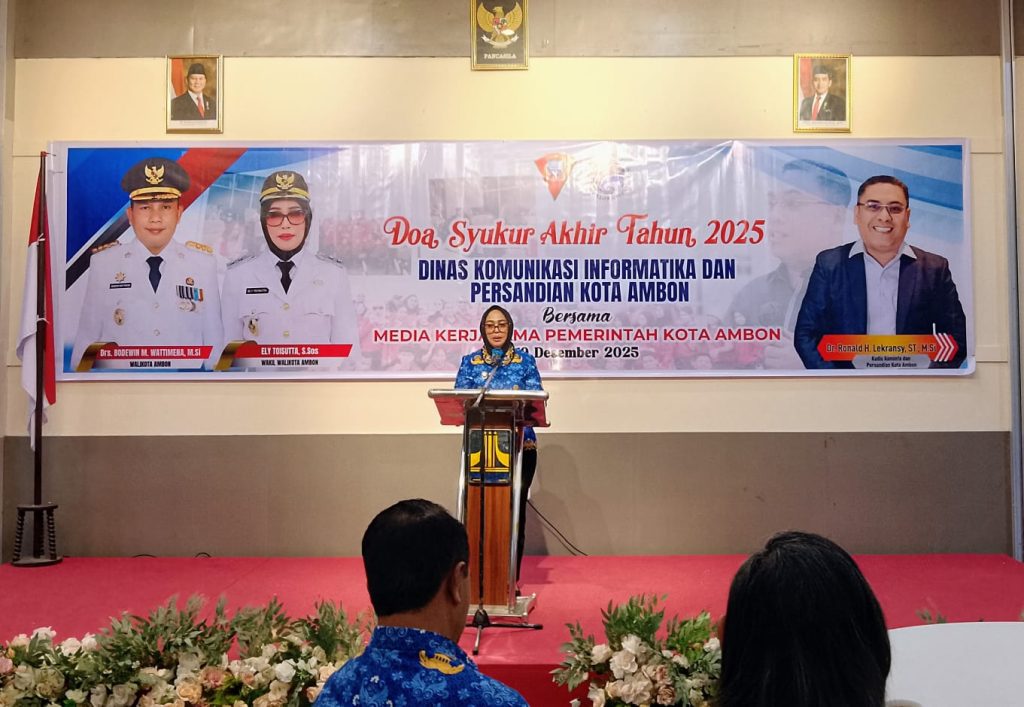 Wakil Wali Kota Ambon, Ely Toisutta, memberikan apresiasi tinggi kepada Dinas Komunikasi dan Informatika (Diskominfo) Kota Ambon beserta seluruh mitra media atas kontribusi dan kolaborasi yang terjalin sepanjang tahun 2025.