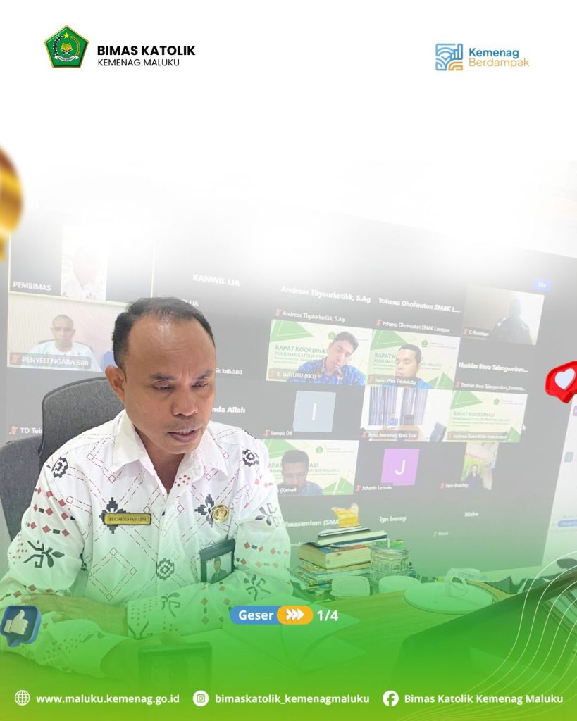 Pembimas Katolik Kanwil Kementerian Agama Provinsi Maluku, Bernard Fanulene, S.Pd, melaksanakan pertemuan via zoom bersama Kepala Seksi dan Penyenggara Bimas Katolik, Kepala SMAK, Kepala Sekolah Taman Seminari se-Provinsi Maluku dan Para Ketua Tim Bimas Katolik Kanwil Kementerian Agama Provinsi Maluku, Kamis, 12/02/2026.