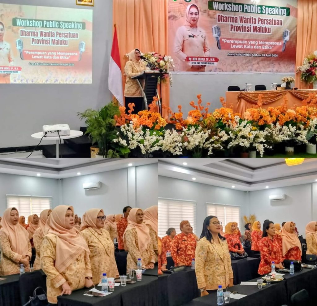 Ketua Dharma Wanita Persatuan (DWP) Provinsi Maluku, Ny. Nita Sadali, SP., M.H., secara resmi menutup Workshop Public Speaking bertajuk “Perempuan yang Mempesona Lewat Kata dan Etika” yang digelar di Grand Avira Hotel Ambon, Selasa (28/4/2026).